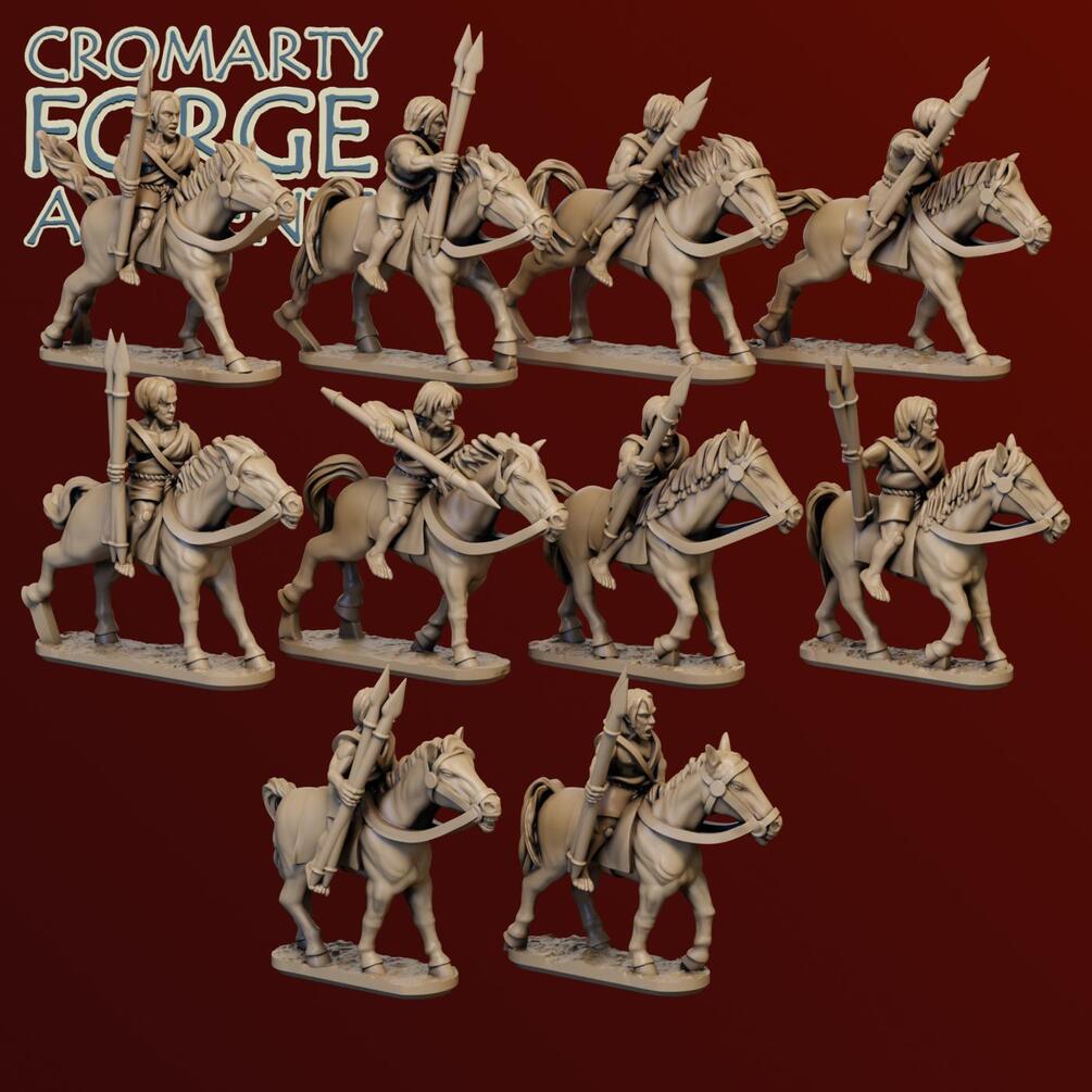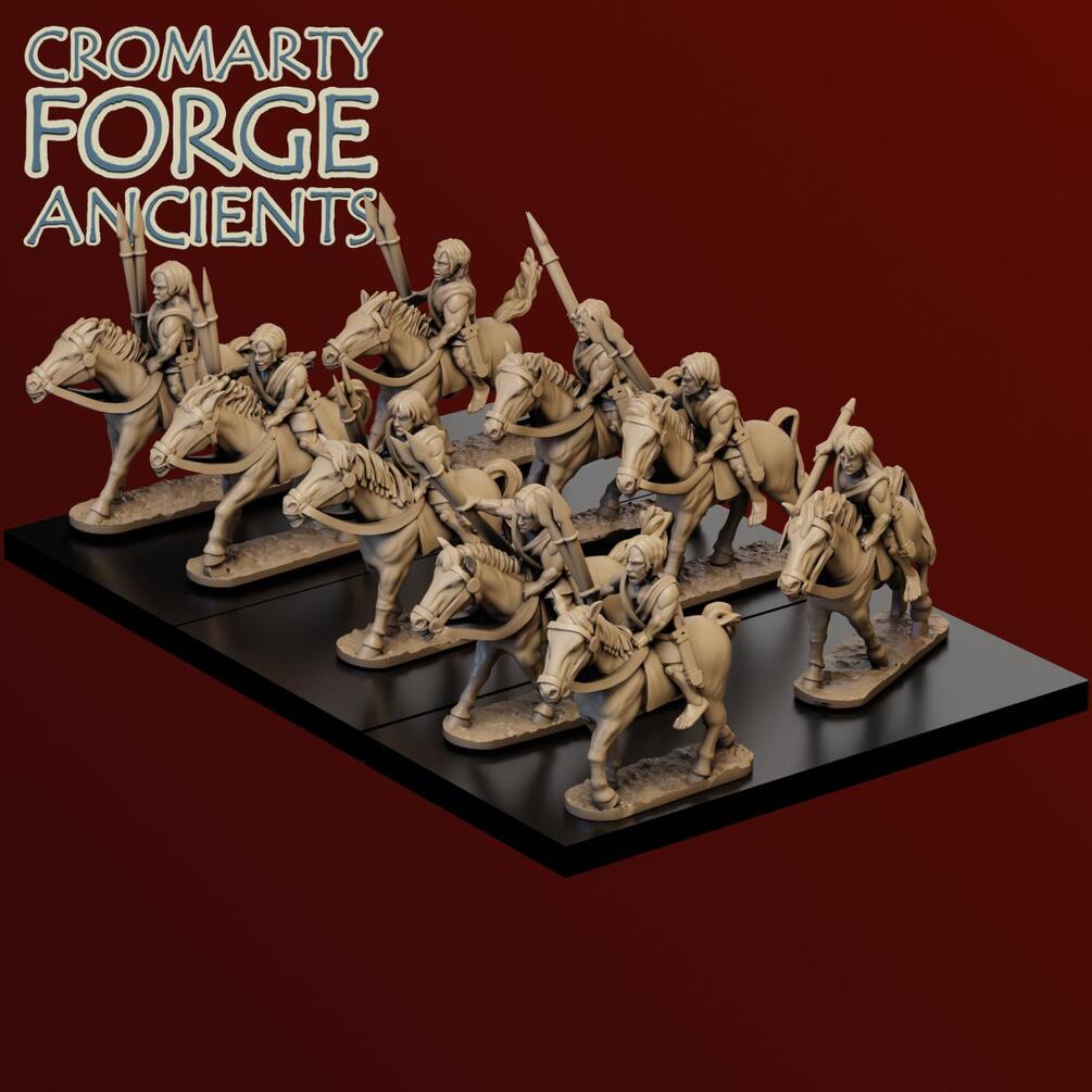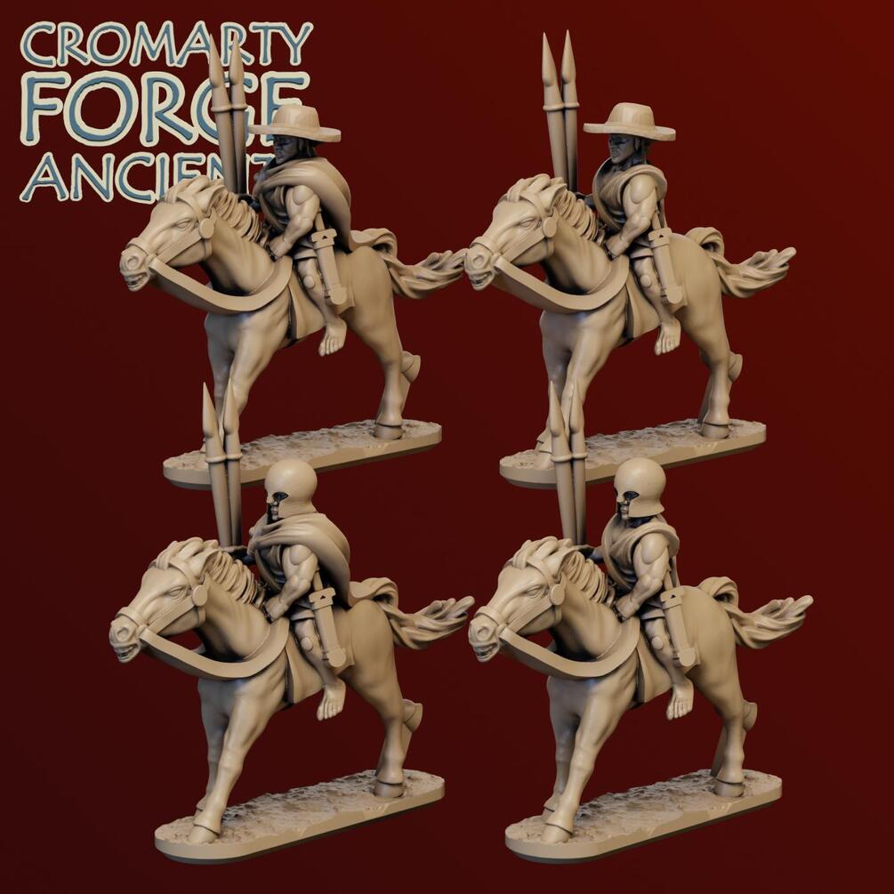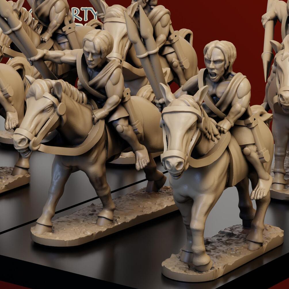 10mm Earlier Greek - Light Cavalry: set contains files to print 10 Greek light cavalry with either wide brim hats, or light helms, and with or without cloaks.
