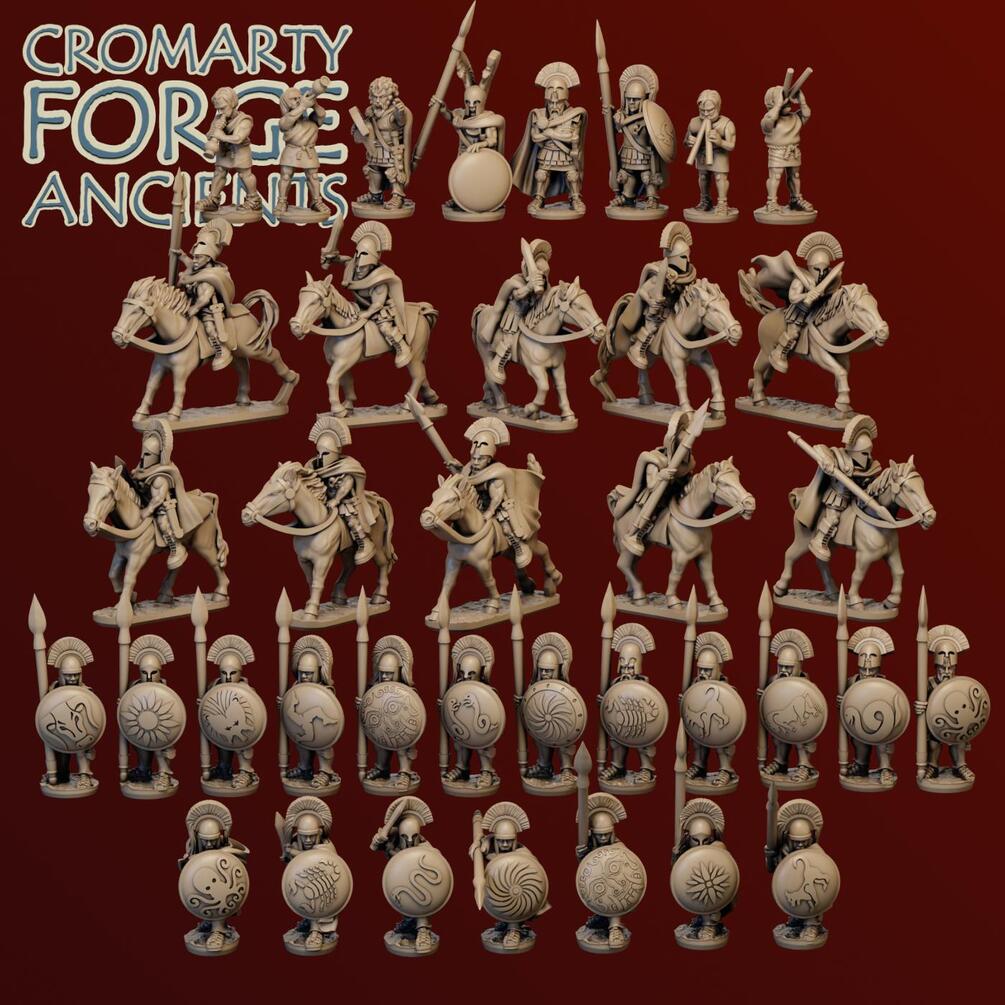 10mm Earlier Greek Command: set contains files to print a large variety of greek commanders, including over 12 poses of hoplite commands, 10 poses of cavalry command, 4 musicians and 3 generals. With the exception of the musicians and generals all models come with at least 2 helmet variations, 2 shield variations and multiple options on cloaks, body armour and shields.