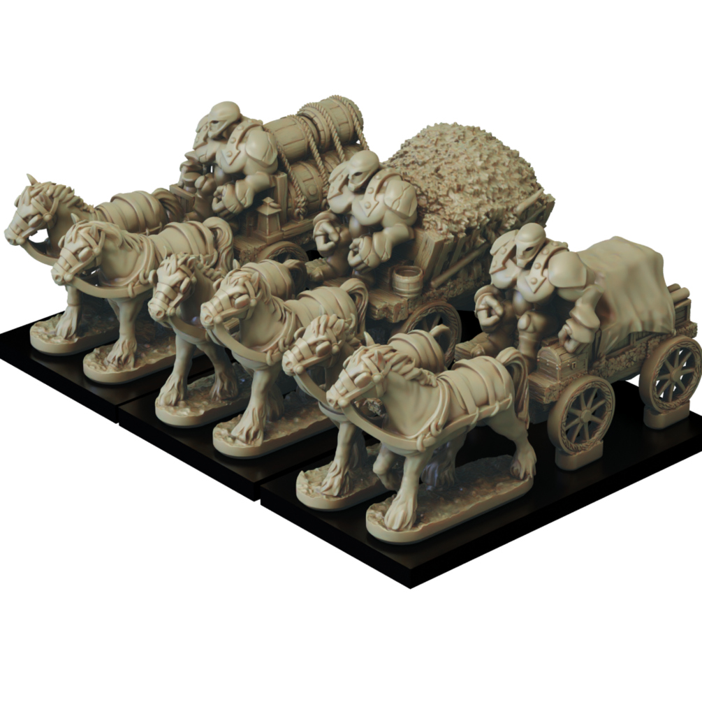 The 10mm Fantasy cart set contains files to print 3 carts, and 6 horses, the carts come in 3 options, Without drivers, with Golem drivers, and with Human drivers.