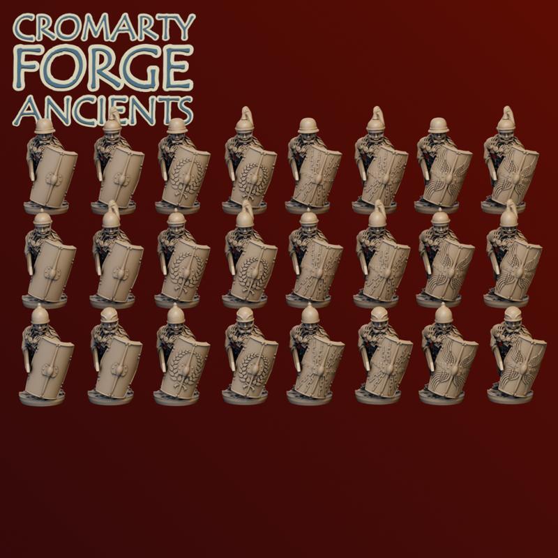 10mm Late Republic Romans: Legion attacking set contains files to print both strip mounted (11 strips including 2 Optio strips, and 2 Centurion strips) and separately mounted late republic legionnaires in combat poses. Each file is supplied with 12 shield and helmet combinations. There are over 130 supported 10mm strips mounted, and over 800 supported separate 10mm files in this set.