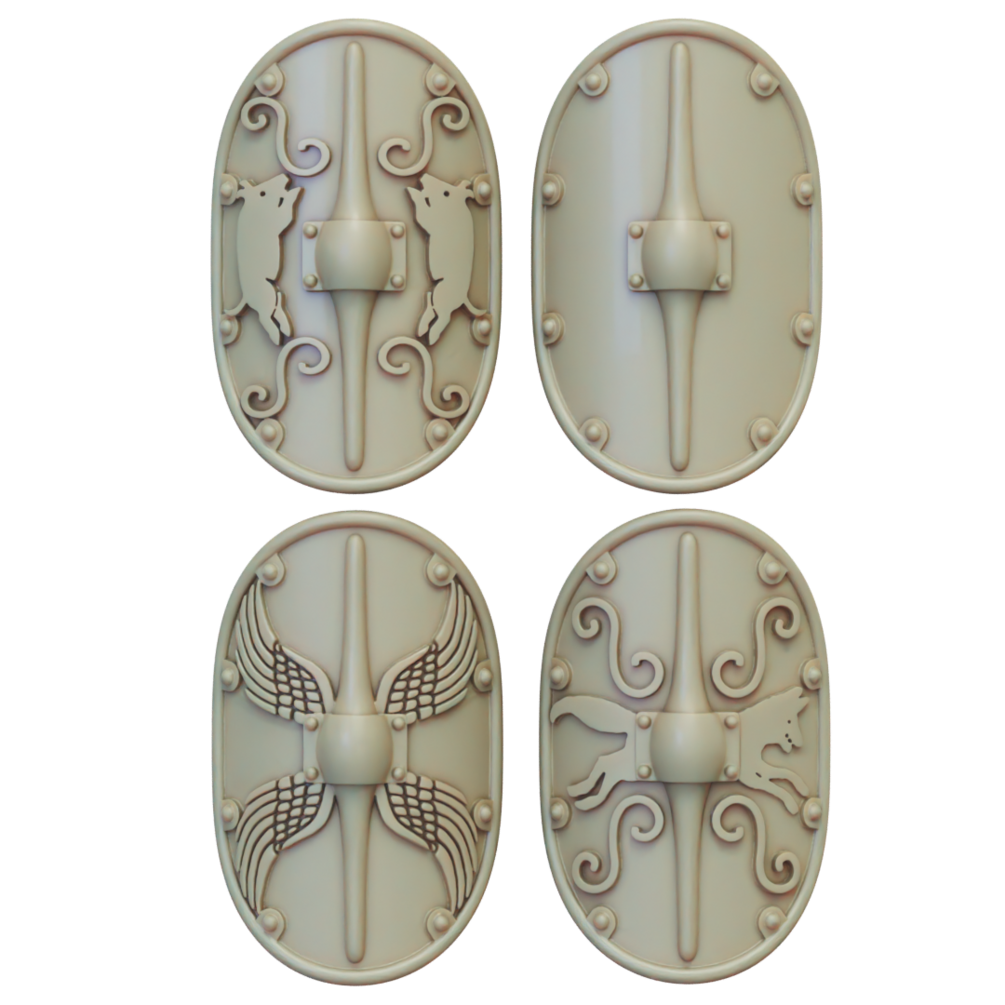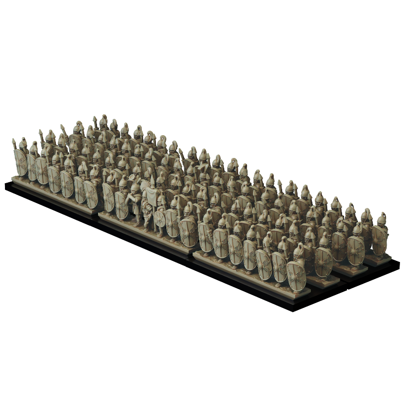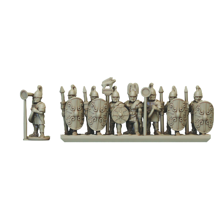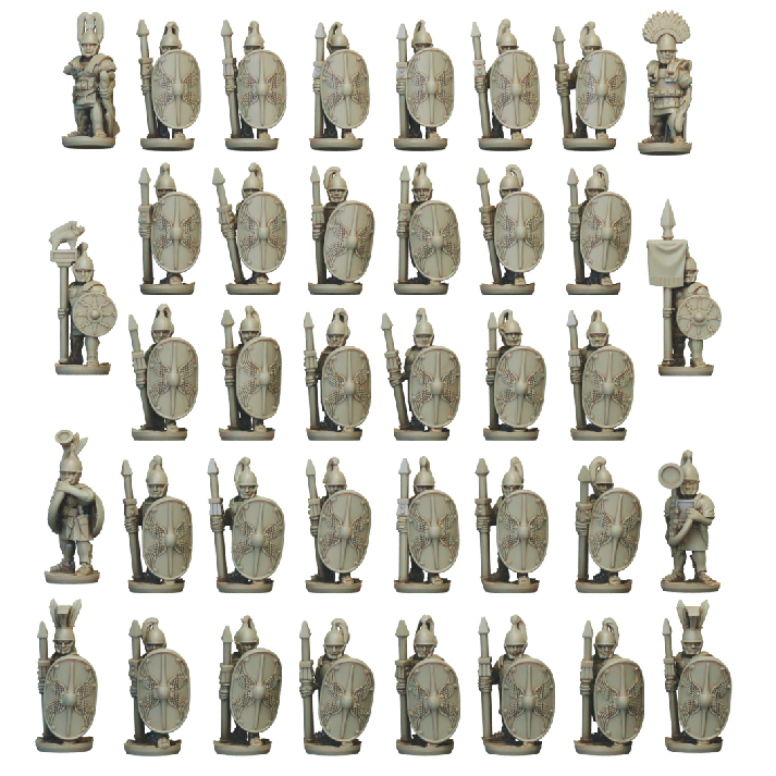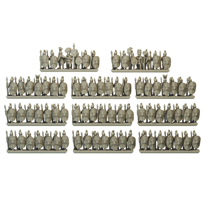 The mid republic Romans Hastati set consists of 11 strips of Hastati (7 base strips, 2 Optio Strips and 2 centurion strips) as well as over 30 separately based sculpts. Models can be printed with one of four alternate Scutum (shield) designs, including a blank option.