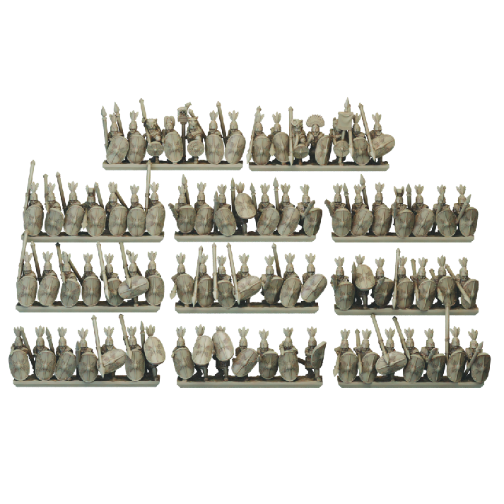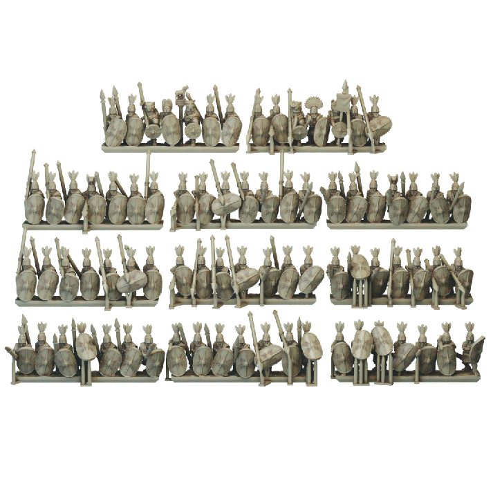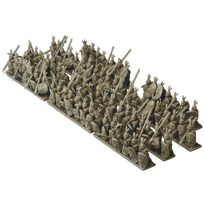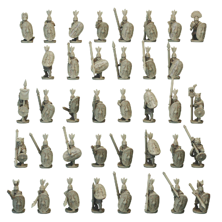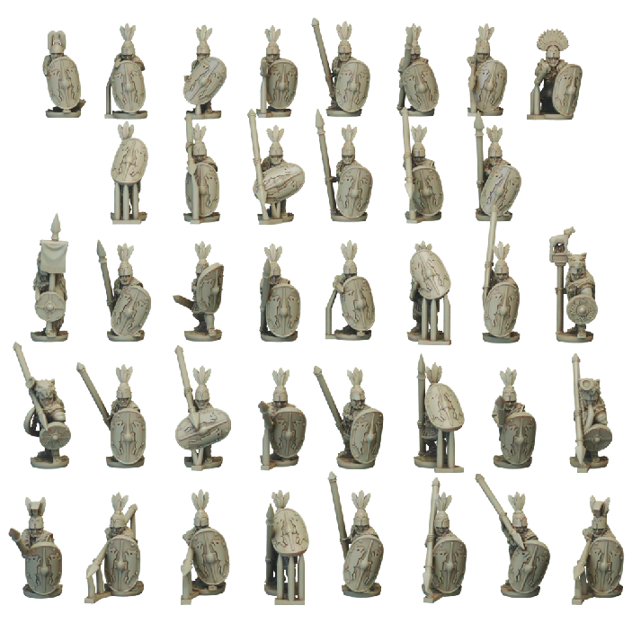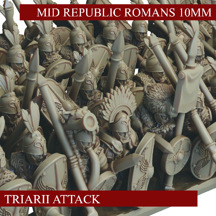The mid republic Romans Triarii Attack set consists of 11 strips of Triarii attacking with Gladius or Spear. (7 base strips, 2 Optio Strips and 2 centurion strips) as well as over 30 separately based sculpts. Models can be printed with one of four alternate Scutum (shield) designs, including a blank option.