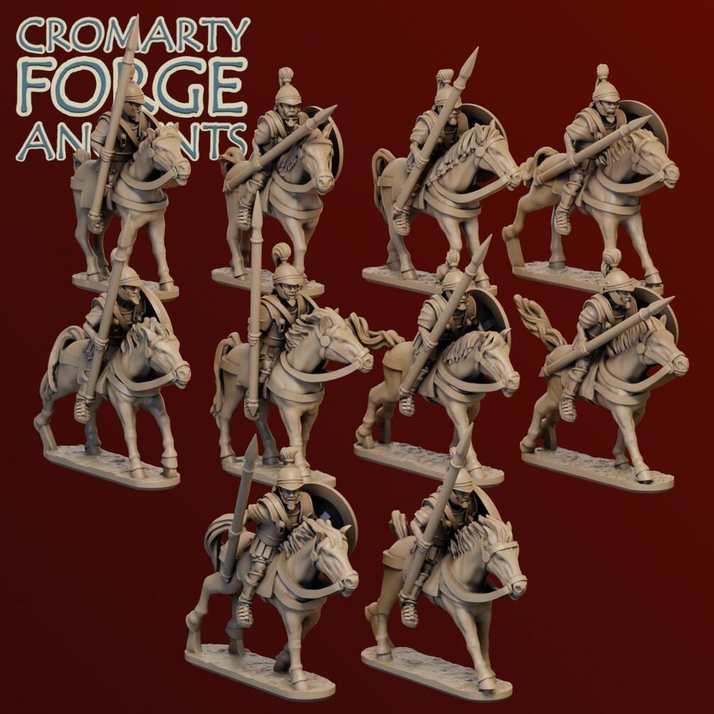 15mm Carthage Punic Cavalry set contains files to print 10 different Punic cavalry models. Each model comes with 4 alternate armour options - 3 types of lino thorax and a muscled cuirass (giving 40 cavalry sculpts in total). The variants with muscled cuirass ride mounts with armoured skirts. Models come with separate Asips.