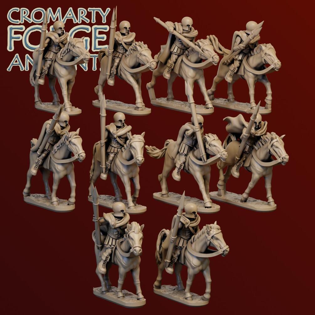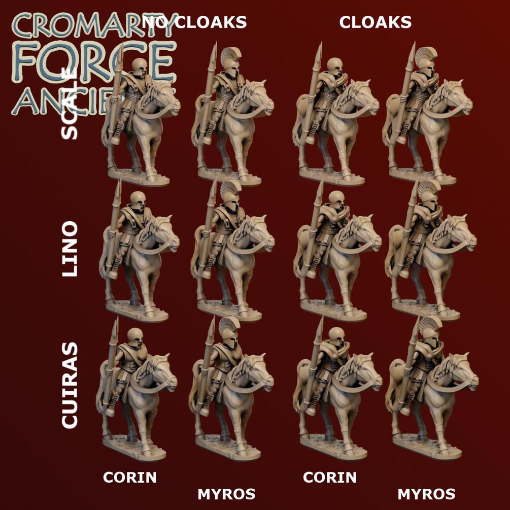 15mm Earlier Greek - Cavalry: set contains files to print 10 Greek cavalry with body armour and either Myros or Corinthian helms, and with or without cloaks.