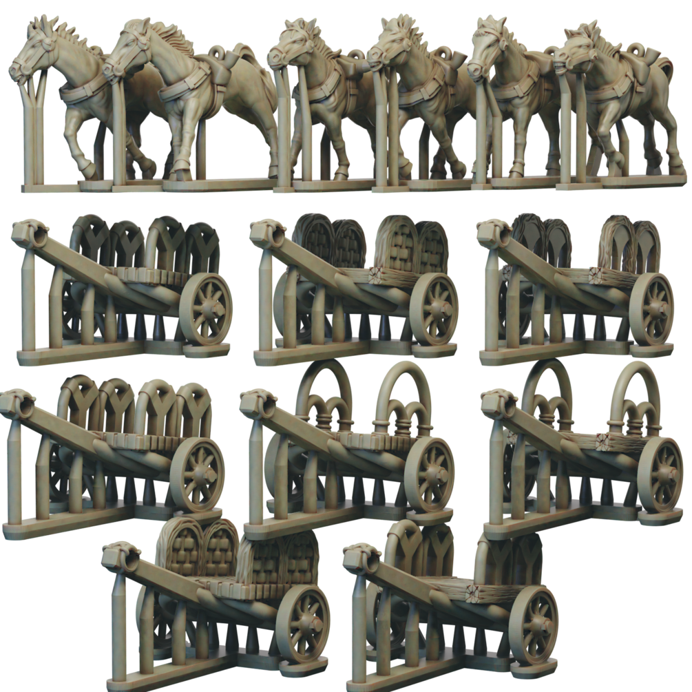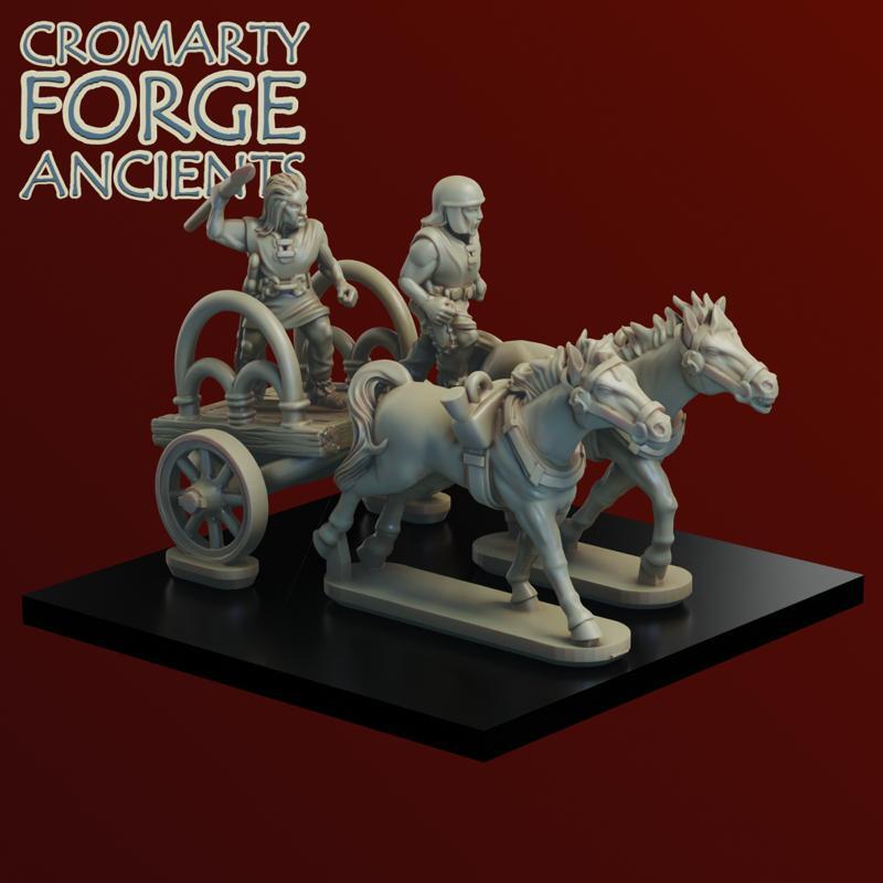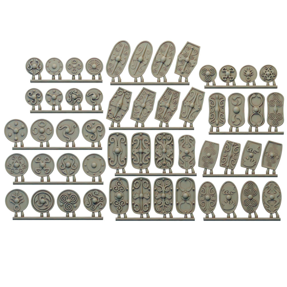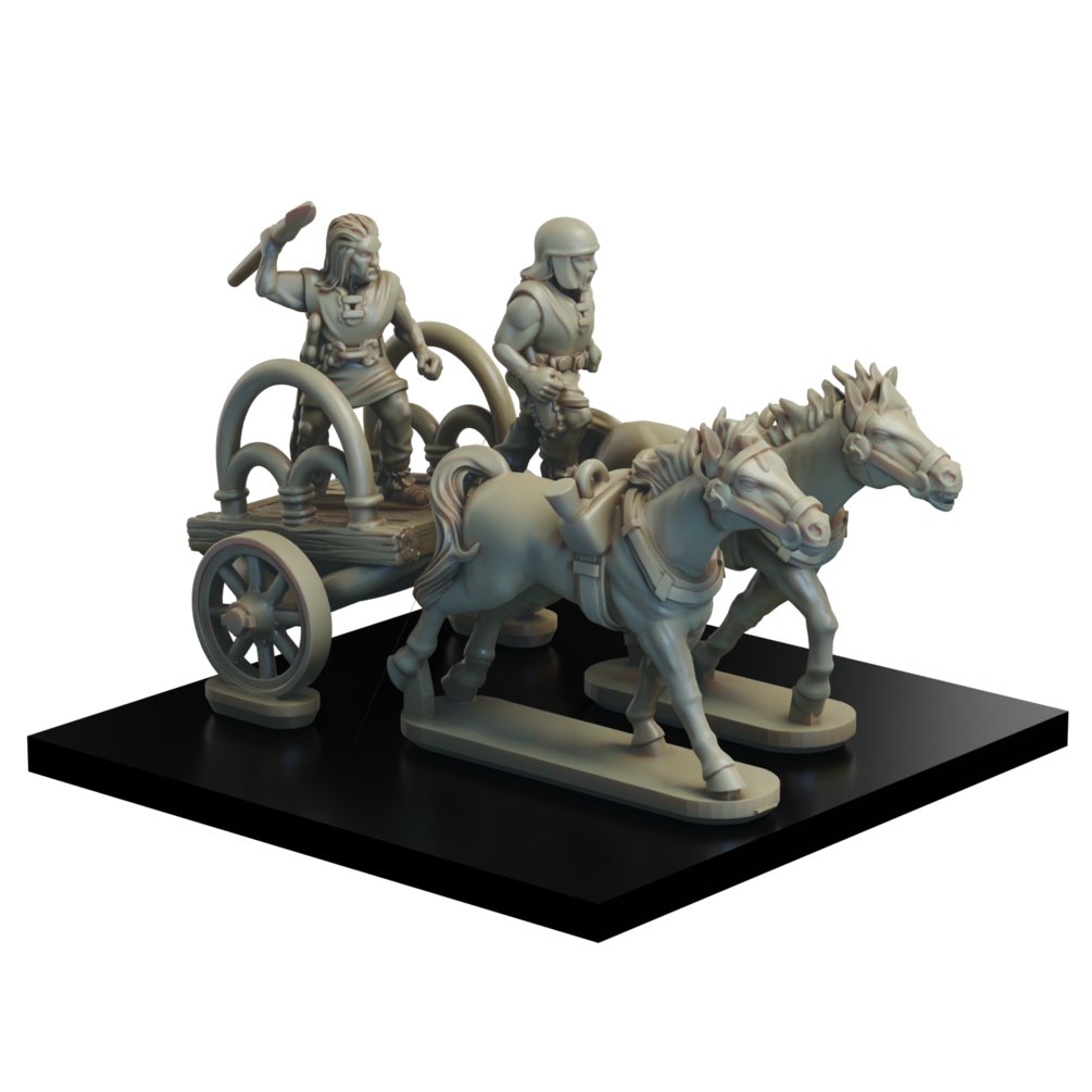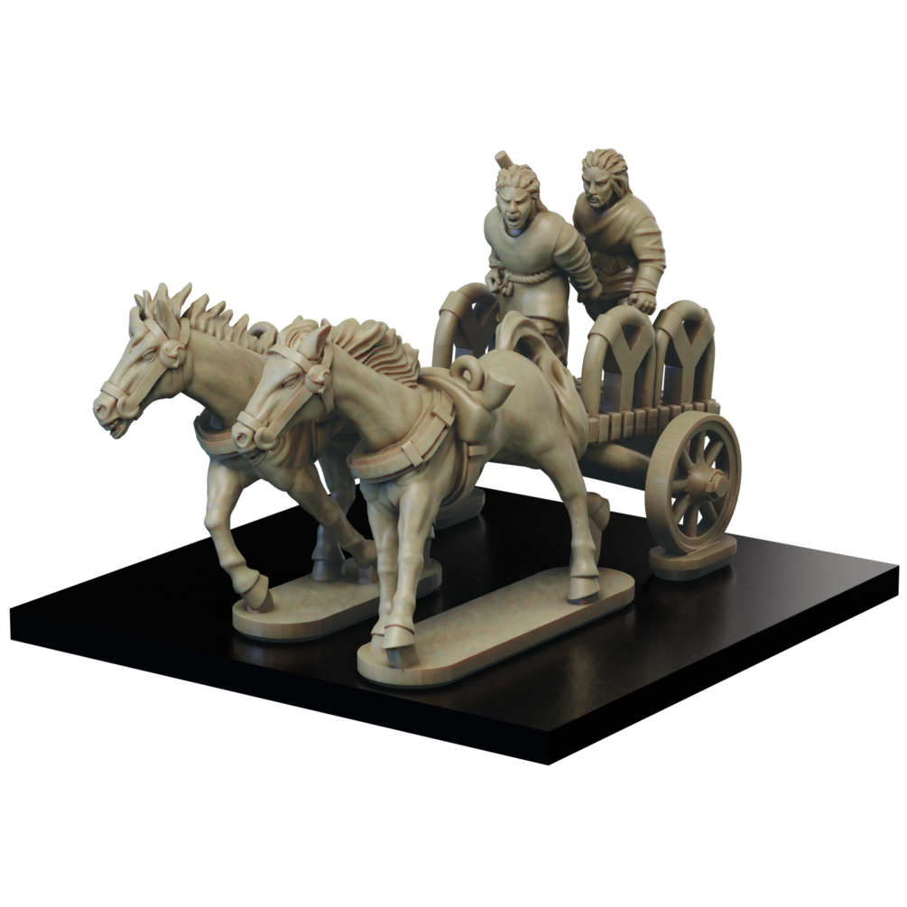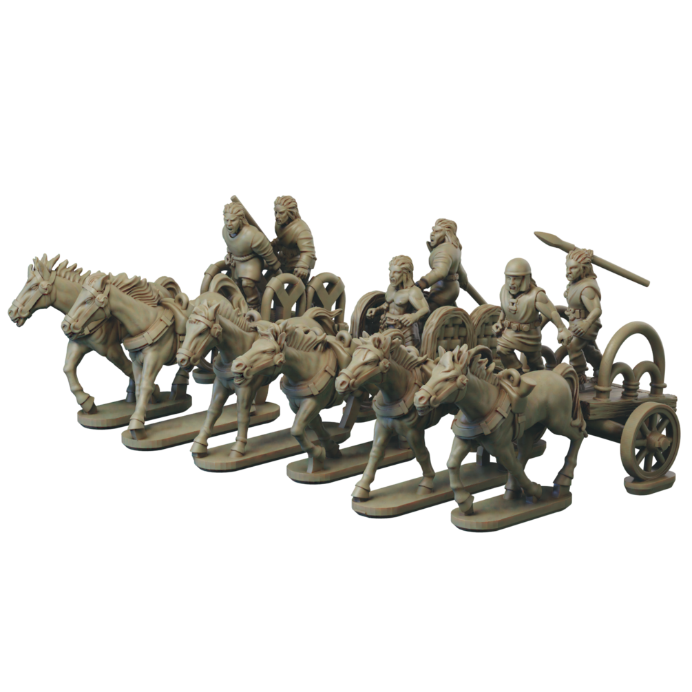 The Gallic Chariot set consists of stl files for 3 chariot crew, 3 chariot drivers, 6 horses and 8 chariots, as well as over 50 shield designs.