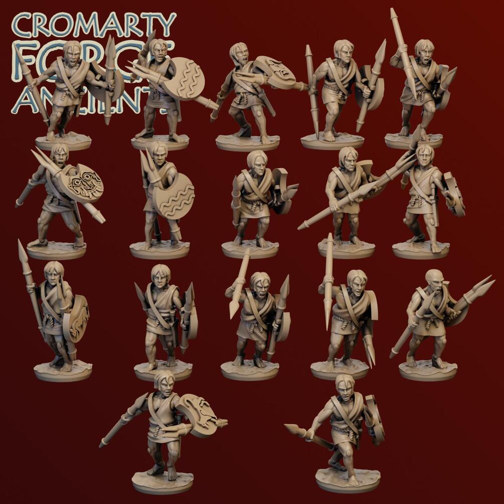 15mm Greek - Peltasts: set contains files to print 16 Greek javelin men with separate peltast shields with various designs with and without javelins. Each sculpt is presented with 4 different head wear.