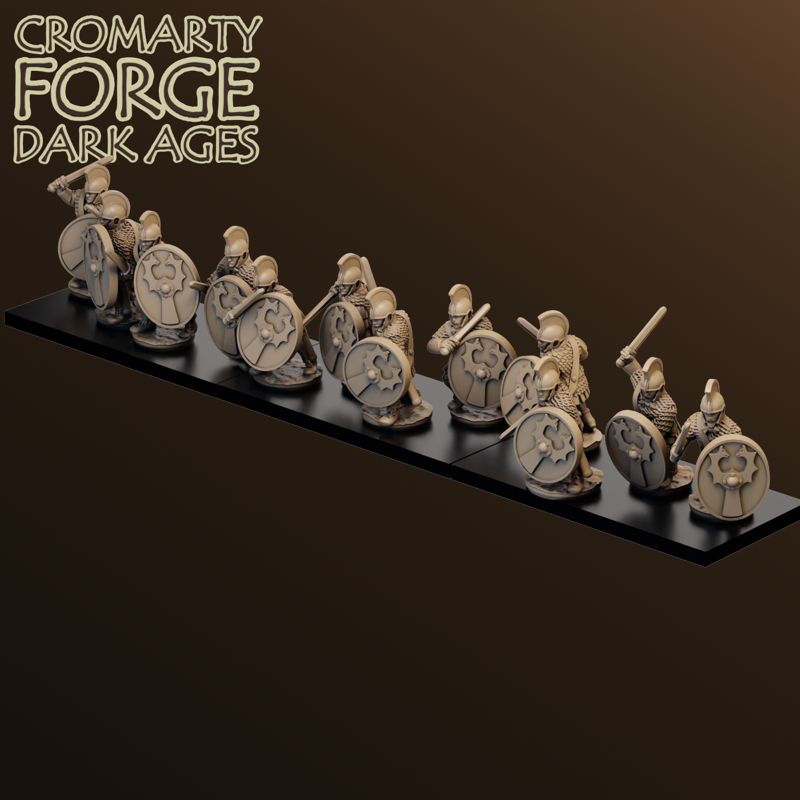 15mm Late Imperial Roman Palatine Attacking set contains files to print 16 late roman Palatine guard in combat poses. Provided with multiple shield options with and without darts.