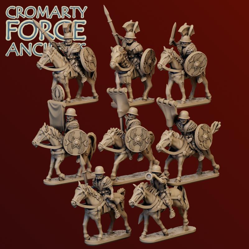 15mm Late Republic Romans: Command set includes sculpts of Julius Caesar and Pompey the Great as well as Augustus (not strictly a republic general... but I didn't resist the opportunity to sculpt him). As well as the generals there are a proliferation of Centurions, Optios, Cornicen, Banners (including an eagle) and rounder commanders. With the exception of the generals each model comes with four alternate helmet options. The set includes a variety of sctutum, Cavalry shields, and bucklers.