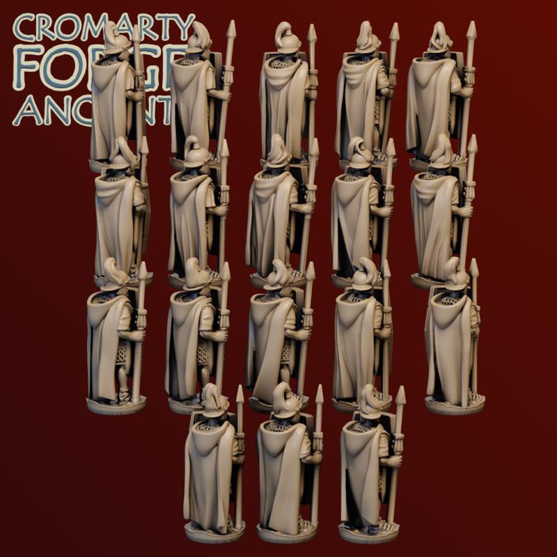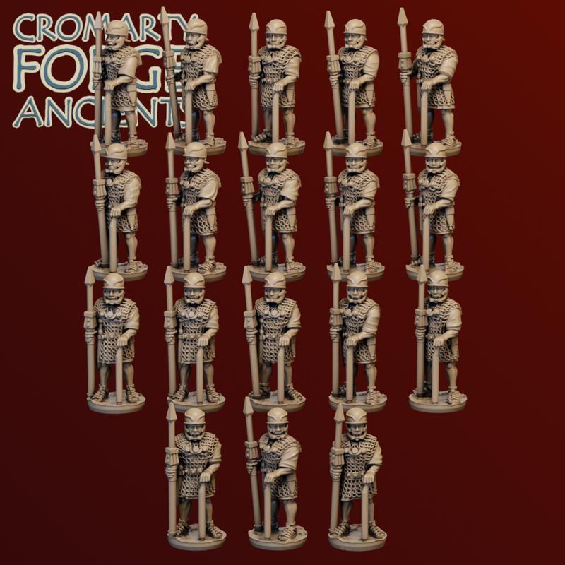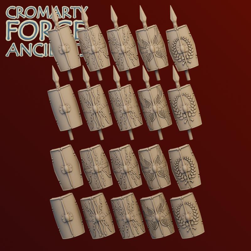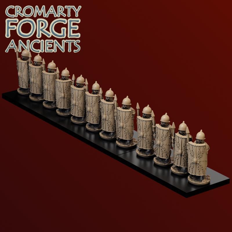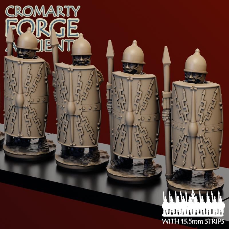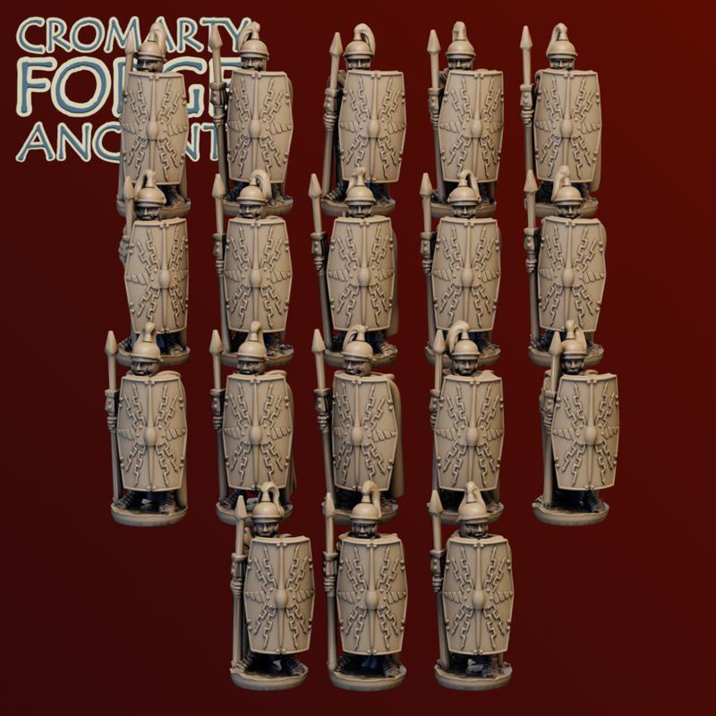 15mm Late Republic Romans: Legion set includes 18 legionary sculpts, presented with six helmet options, and with optional cloaks. Each sculpt has 12 helmet / cloak options. The set comes with 20 different scutum options (5 designs - including a blank - two shapes, and with or without a short spear).