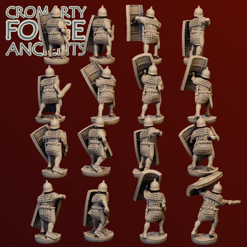 15mm Late Republic Romans: Legion attacking set consists of 16 sculpts of legionaries in attacking poses. Each sculpt is presented with 6 helmet options. The set comes with 20 different scutum options (5 designs - including a blank - two shapes, and with or without a short spear).