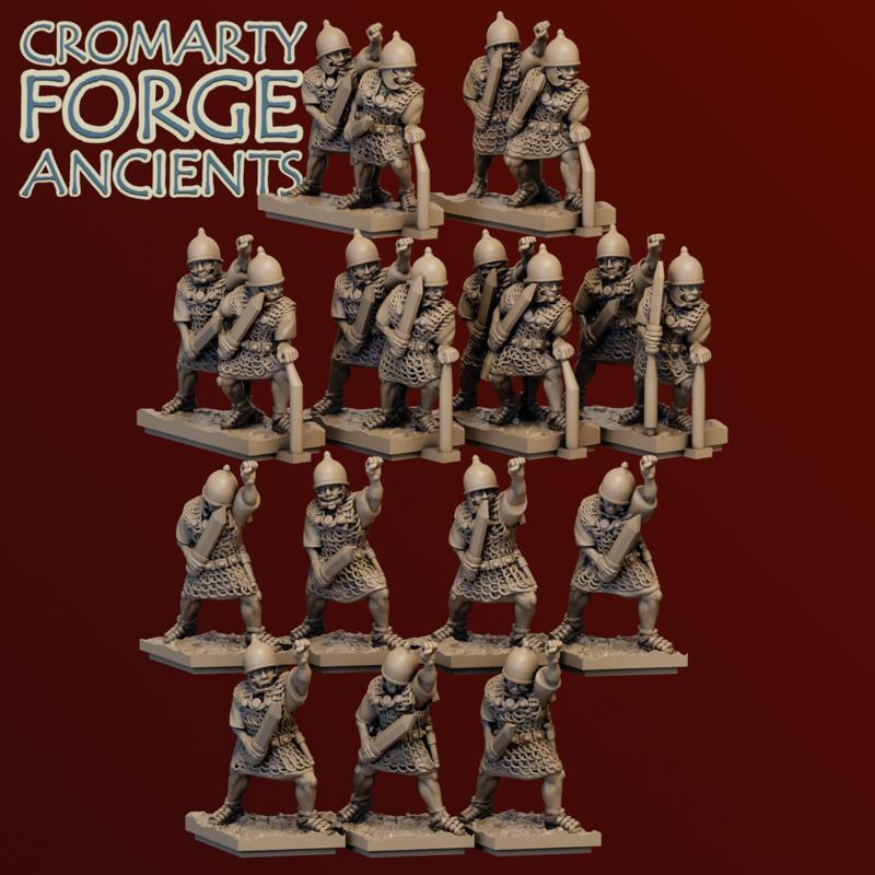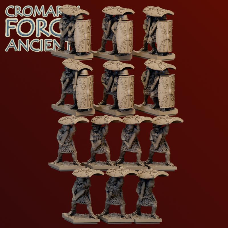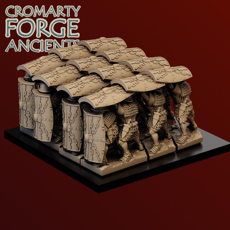15mm Late Republic Romans: Testudo set comes with six pairs of testudo front ranks, and seven testudo back rank sculpts. Each sculpt comes with four helmet options. The set comes with two sets of scutum, one for the front rank, and a thinner set for the roof of the formation. each scutum comes with five alternate designs (including a blank). This formation does not work with the spear scutum options