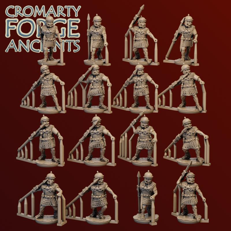 15mm Late Republic Romans: Throwing Pila set consists of 16 sculpts of late republic legionnaires posed in the act of throwing their pilum. Each sculpt comes with six helmet options. The set comes with 20 different scutum (5 designs - including a blank - two shapes, and with or without a short spear).