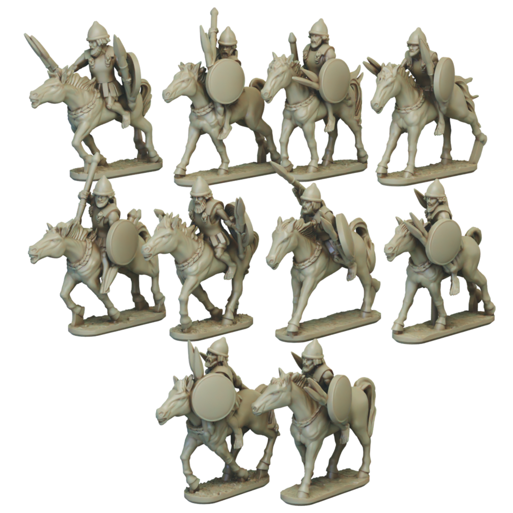 The 15mm Armoured Cavalry set consists of 10 Numidian horsemen armed with multiple javelins and wearing linothorax armour.