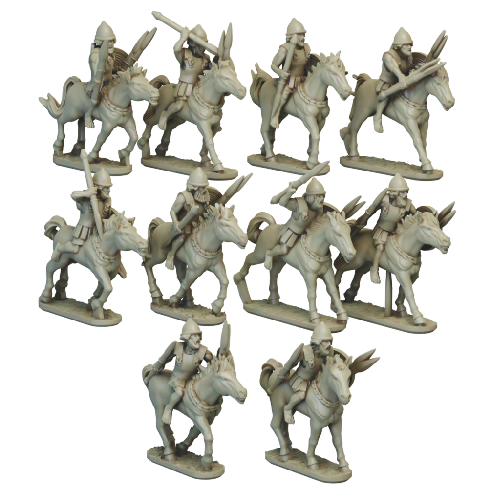 The 15mm Armoured Cavalry set consists of 10 Numidian horsemen armed with multiple javelins and wearing linothorax armour.