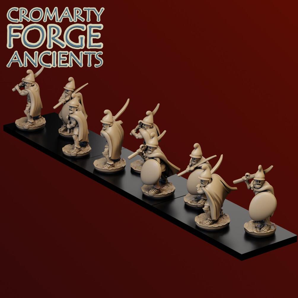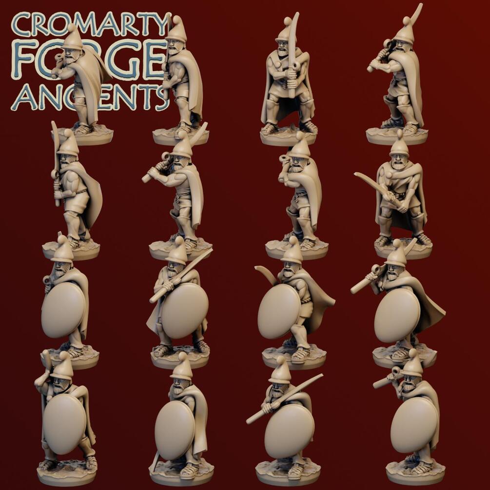 15mm Thracian : Rhomphaia attacking set contains files to print 16 Thracians armed with the iconic rhomphaia sword in combat poses with and without cloaks and those armed with shields, with four shield options. Separate commanders can be found only in the command set.