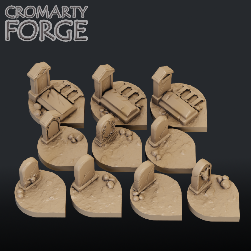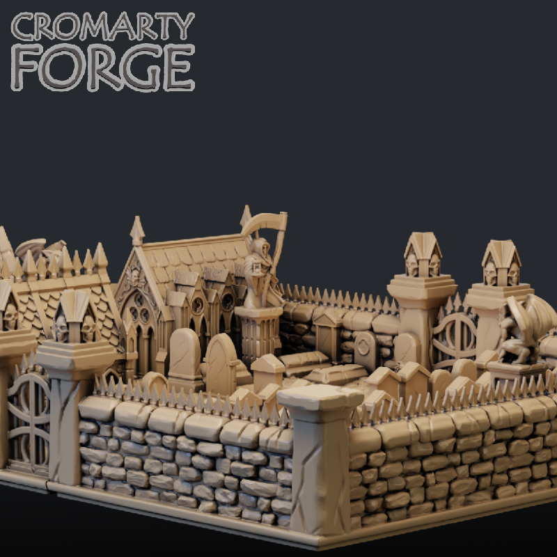 The Graveyard is in two sections (plus 3 mausoleum and a statue) for ease of painting and so that it will fit most printers (largest part is 98mm / 70mm X-Y). The graveyard is approx 120mm x 100mm x 30mm when assembled.
