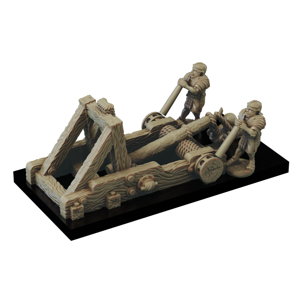 The Imperial Romans Artillery set consists of a Scorpion (Bolt thrower) and Onager (Catapult) and 8 crew. These models are provided pre-supported, so that you can print them flat on the print head of a resin 3D printer (unsupported version are also included). However, every machine has its own unique requirements so please ensure you are happy with the files before you print.