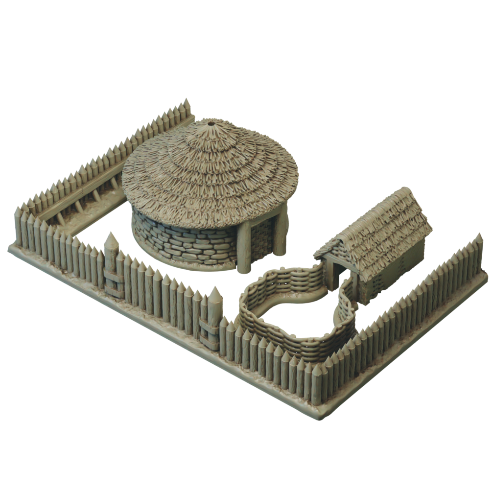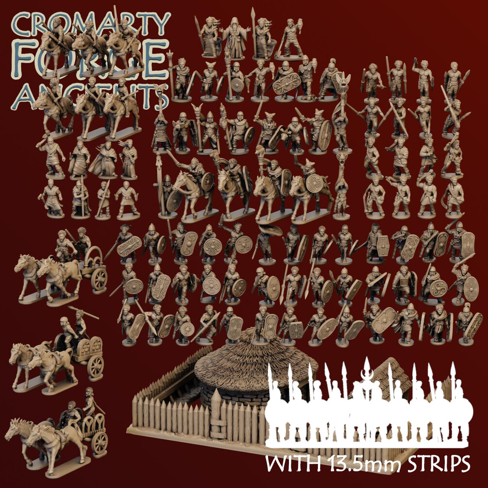 The Briton + Gallic 15mm full army consists of all of the files from all of the 15mm Gallic and 15mm Briton sets, plus the round house camp and village defenders, so that is: