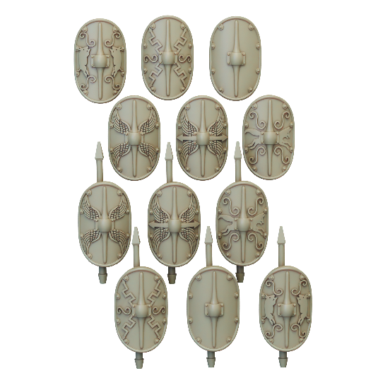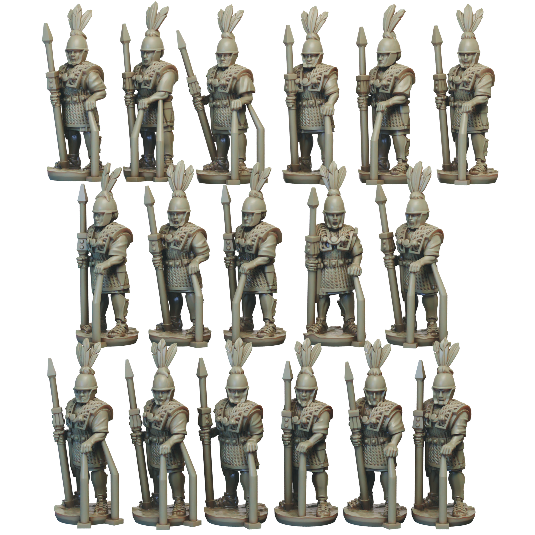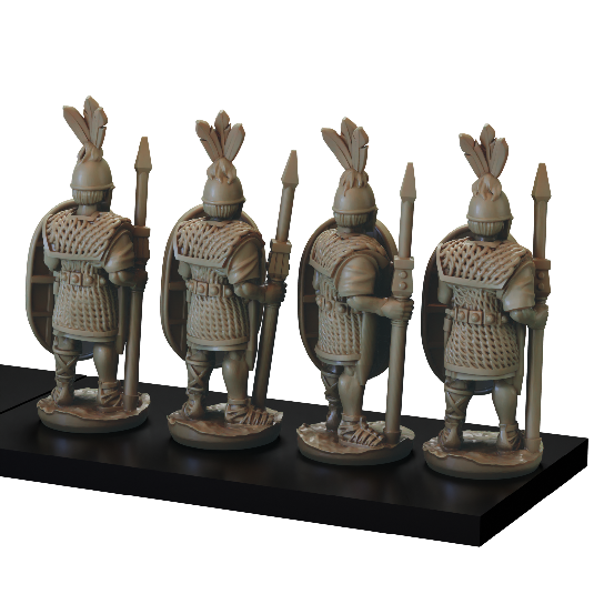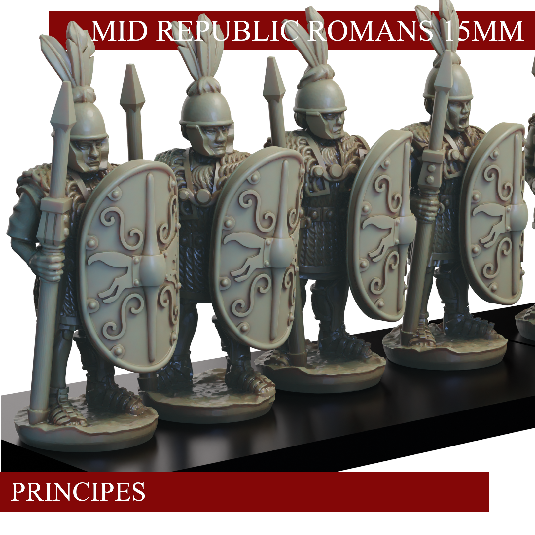 The mid republic Romans Principes set consists of 16 Principes armed with Pila and Gladius. Supplied with files for 12 different scutum: 5 designs and a blank, with and without imbedded Pilum.