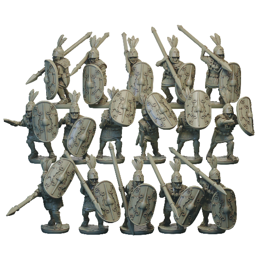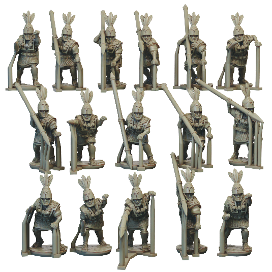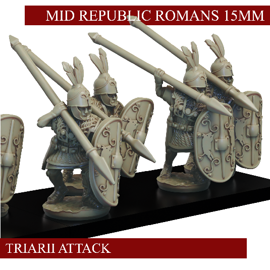 The mid republic Romans Triarii Attack set consists of 16 Triarii attacking with Gladius or Spear. Supplied with files for 12 different scutum: 5 designs and a blank, with and without imbedded Pilum.