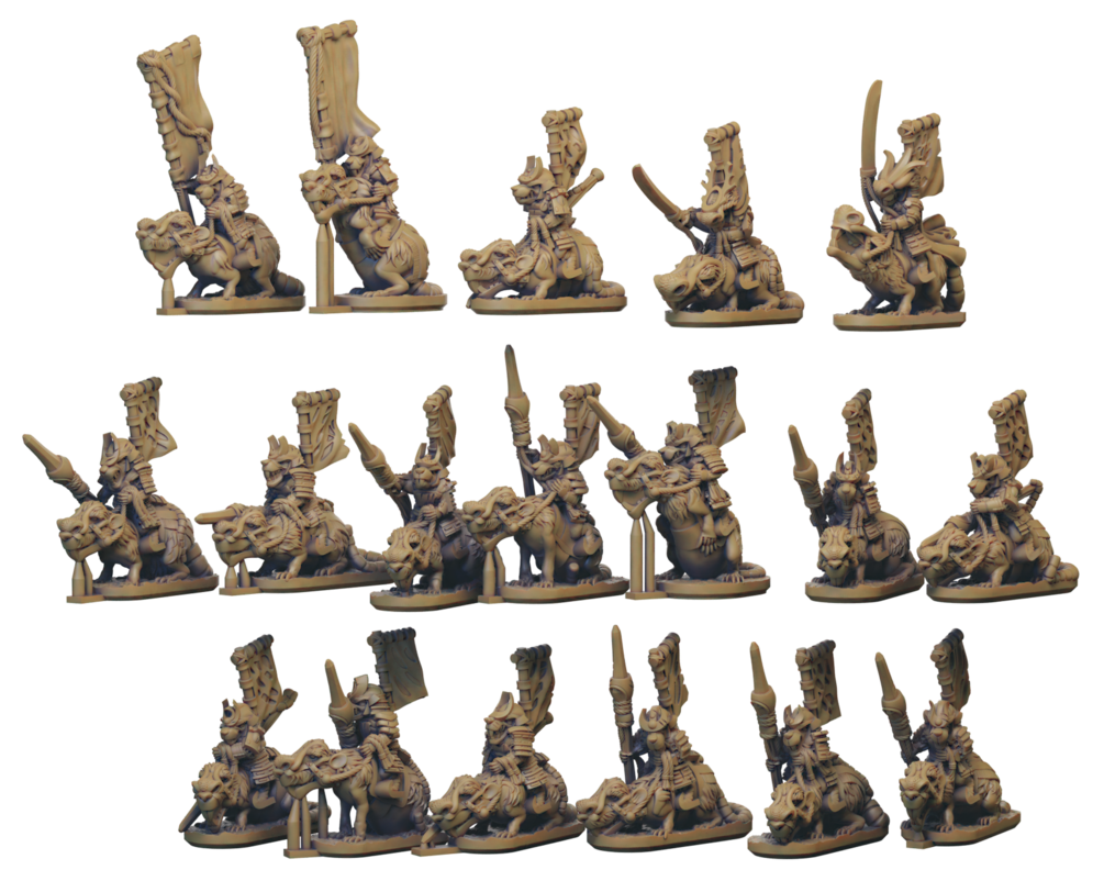 The Mounted Samurai are an expansion to the Ratmen army for use with the experimental Nippon list for WM revolution. This set comprises of 9 strips of 2 mounted samurai, 2 with heroes, and 2 with banners. Additionally there are 18 separated mounted samurai (including 2 banners and 2 heroes). The supported versions of these files are intend to be printed flat on the print head of a resin 3D printer. However, every machine has its own unique requirements so please ensure you are happy with the files before you print.