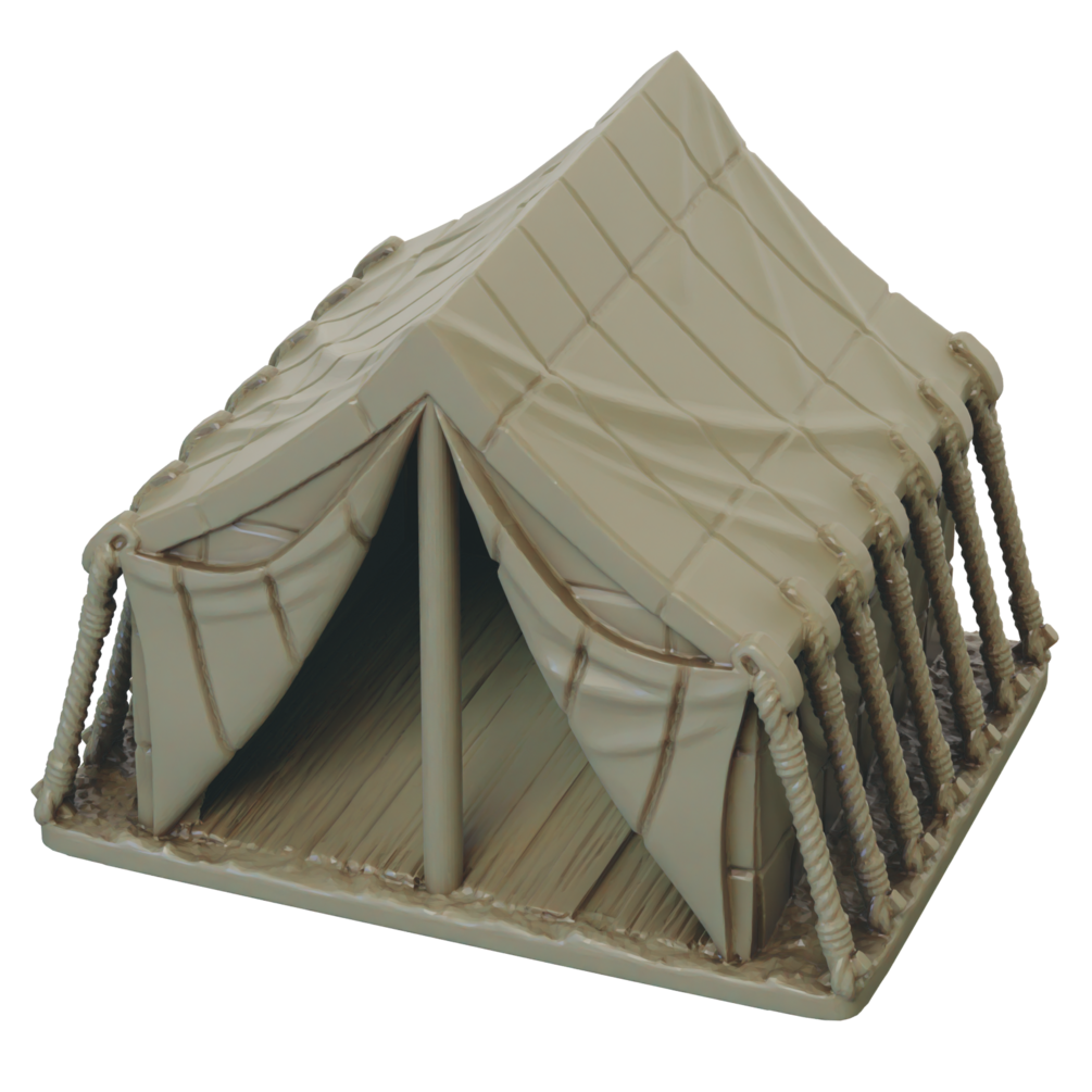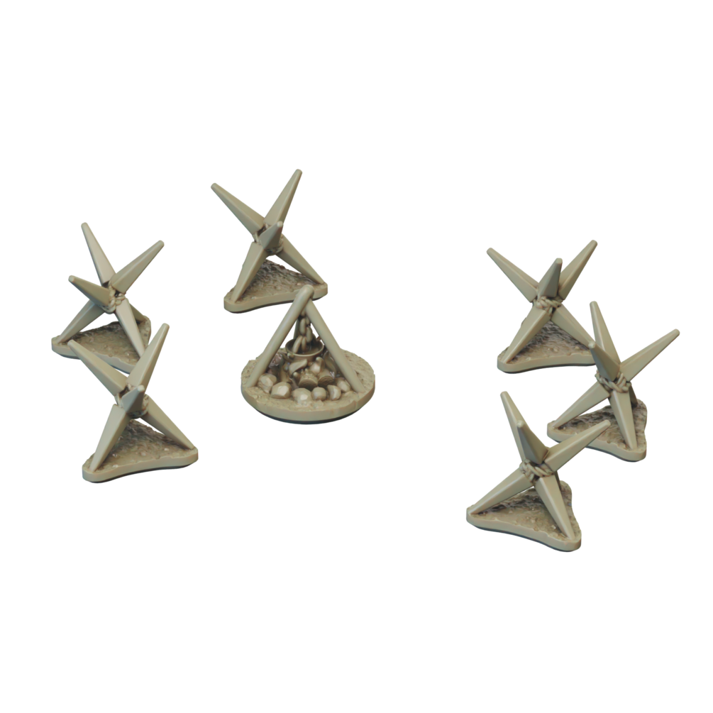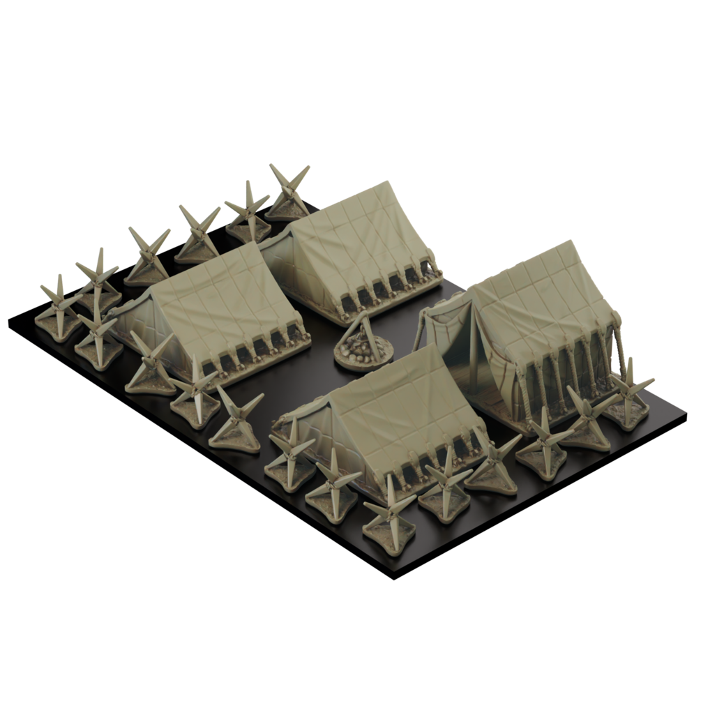 The roman camp set includes a wooden roman fort, three legionary tents, two command tents, a camp fire and four Sudis Ericius. The fort walls are designed to cover three sides of a 120mm * 80mm base.