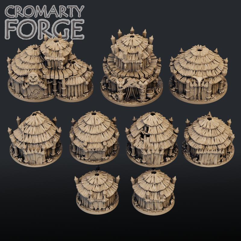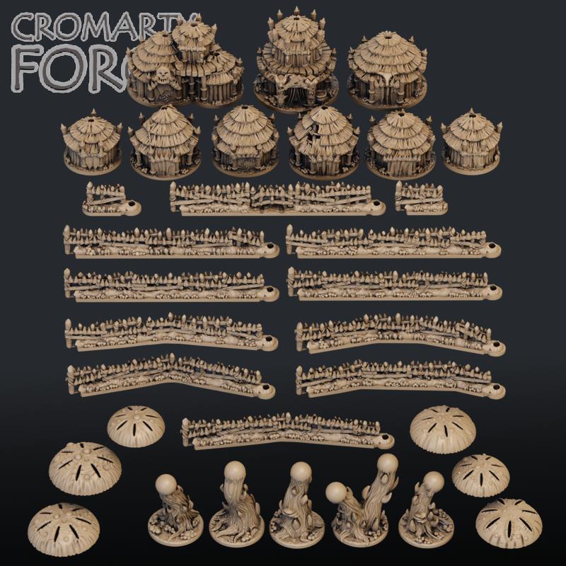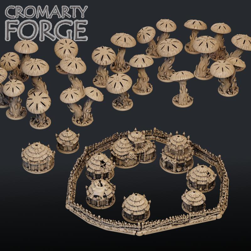 This set of stl files contains what you would need to print an Ork Village, Mushroom Forest and Ork Fences. There are 9 Huts, including a big boss hut and a Shaman hut. There are 10 fence sections, including a gate, as well as two fence ends. The Shroom forest consists of five Shroom stalks and 6 shroom caps.