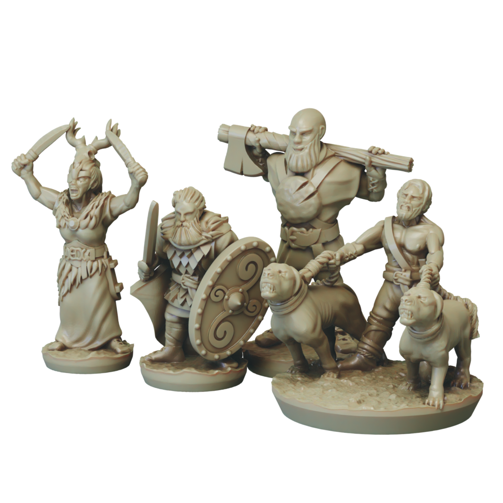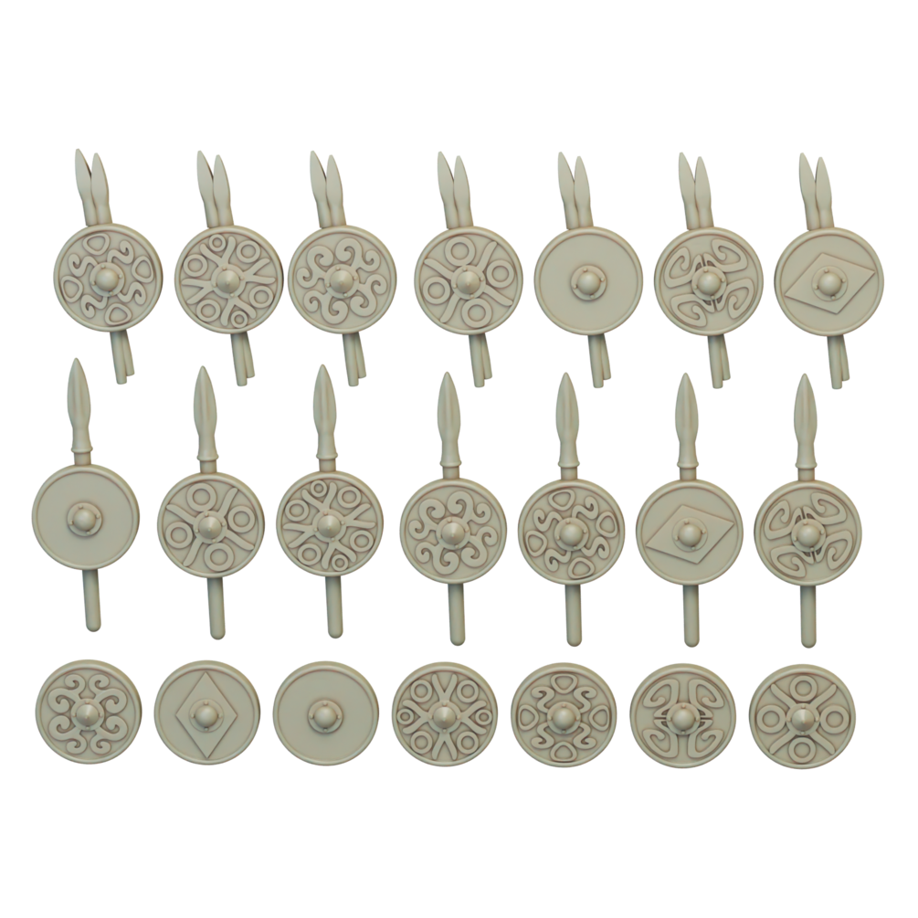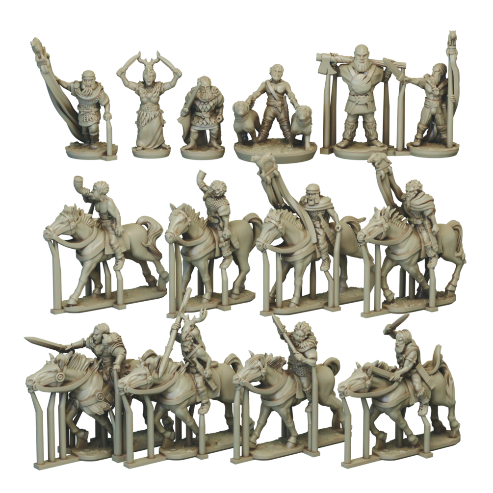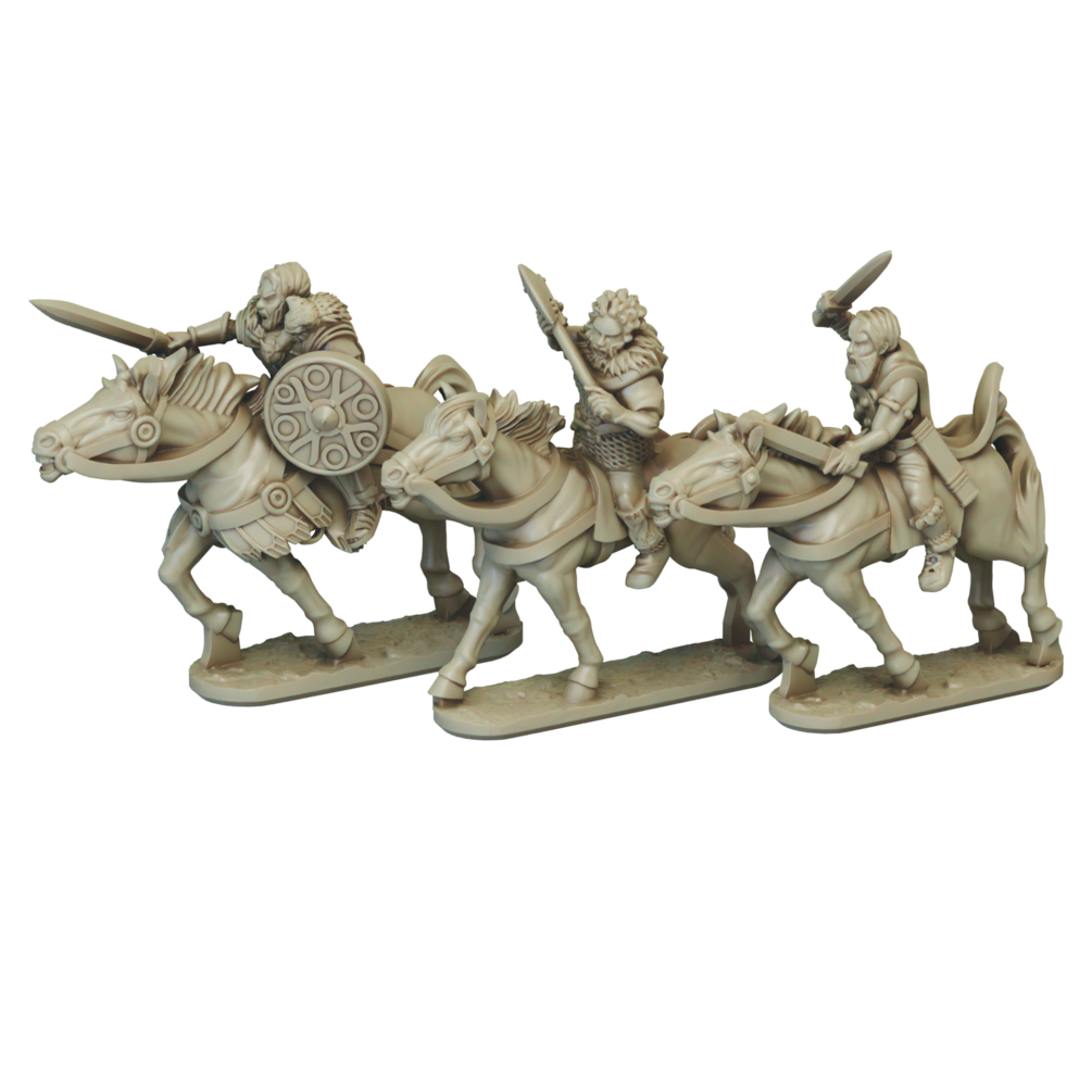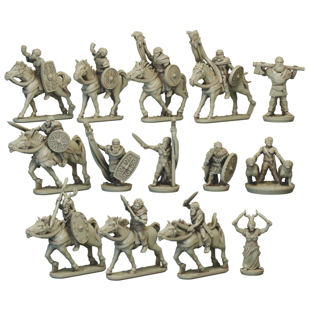 The germanic command set consists of 14 germanic miniatures representing generals, tribal chiefs and support. 8 of the miniatures are mounted, the rest are on foot. The models are supplied with separate infantry and cavalry shields.