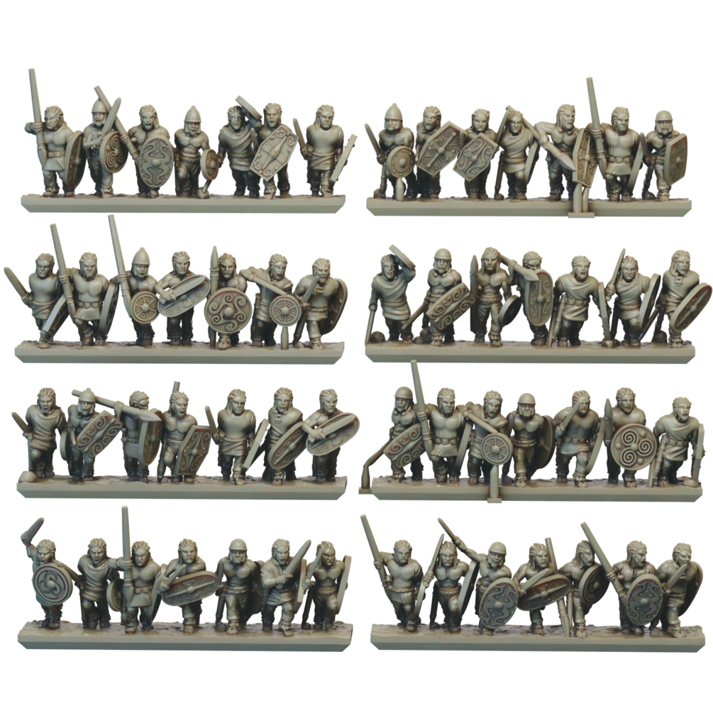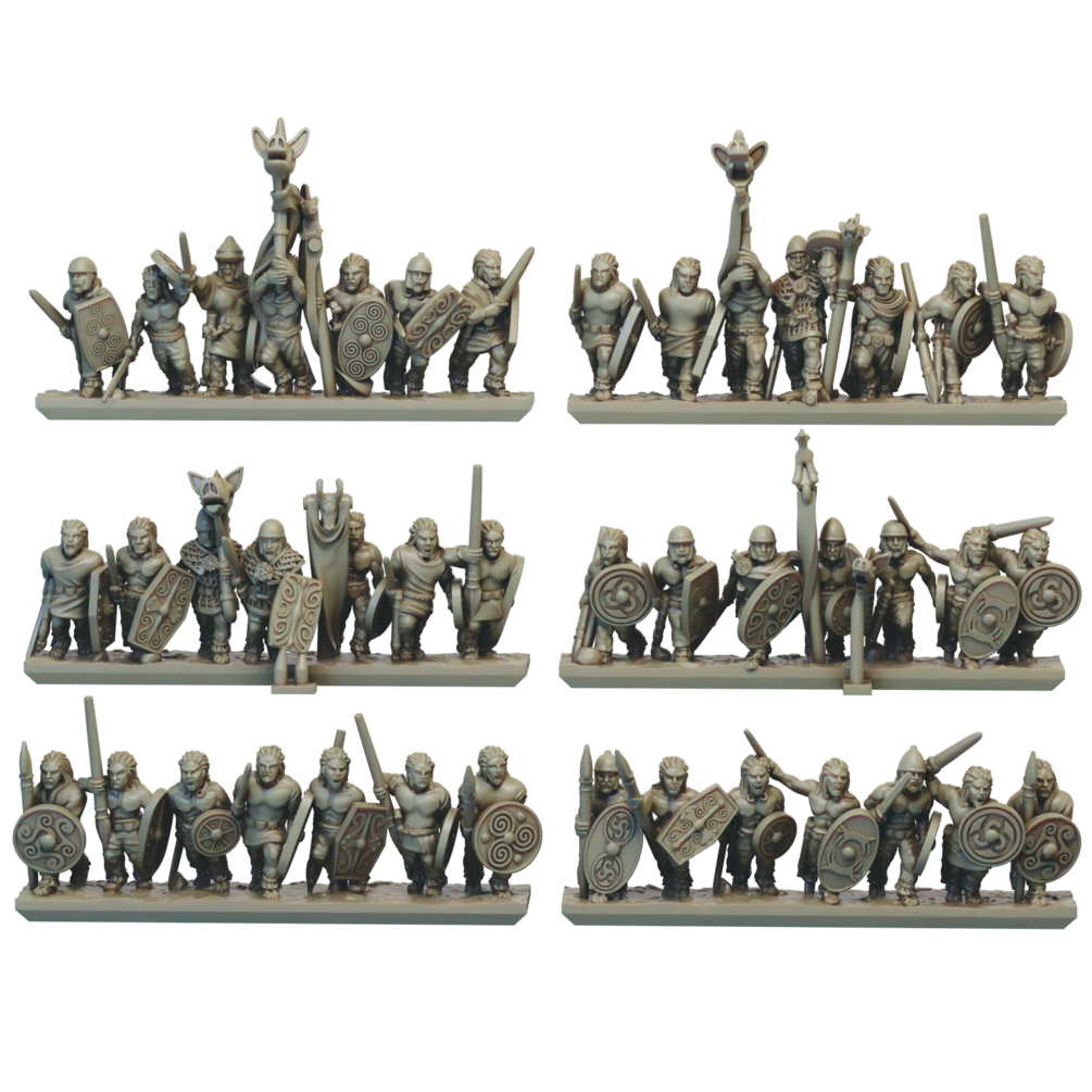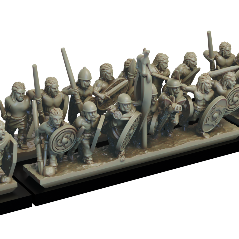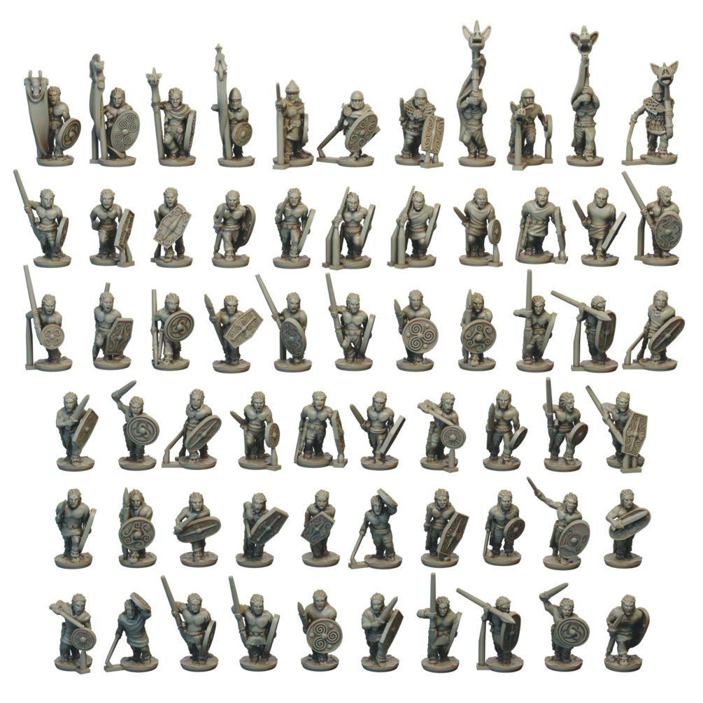 The gallic warriors set contains stl files for 14 strips of gallic warriors (10 warrior strips + 4 banner strips) as well as over 50 separate warriors (including 4 commanders, 4 Carnyx players and 4 banners).